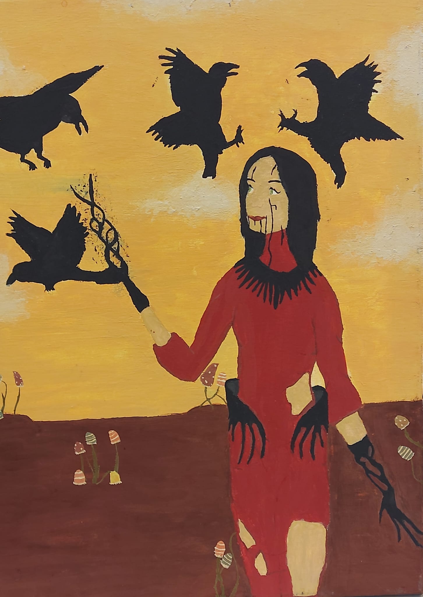 Ein Teil der Ausstellung sind die surrealistischen Gemälde, die im ersten Semester entstanden waren. Aufgabe war es, entweder ein Gedicht oder einen bereits geträumten Traum auf die Leinwand zu bringen. Die Ergebnisse sind beeindruckend. Der Surrealismus gab den Künstlern – so kann man sie zweifelsohne nennen – die Möglichkeit einer ganz besonderen Selbstbespiegelung. Zu sehen sind Landschaften, die der Realität nachempfunden, ihr jedoch seltsam entrückt sind. Da sind Figuren, die menschlich oder doch etwas viel Gefährlicheres sein könnten. Die Werke sind originell und konfrontieren den Betrachter mit unbeantwortbaren Fragen: Wie unterscheidet sich die Traumwelt von unserer, was ist also Realität? Es gibt heutzutage nur noch wenig Raum für Jugendliche, die sich solchen Fragen kreativ widmen wollen. Wenn ich vorhin die Sinnhaftigkeit der Schule angezweifelt habe, so wird der Zweifel hier wieder aus dem Weg geräumt.