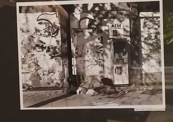 Ein weiteres Highlight stellen die bereits angesprochenen Fotografien dar. Das einfach anmutende Thema lautet „Schatten“ und hat doch wohl gerade wegen seiner Einfachheit die größten formellen Abweichungen produziert. Ein Foto trägt beispielsweise den Titel „Sparflamme“ und bildet eine Art in violettes Licht getauchte Höllenlandschaft ab. Vielleicht – so meint die Künstlerin – stellt es das sehr spezifische Gefühl dar, das sich nach einer langen Stressperiode einstellt: Entspannung in der Erwartung schon bald wieder aufkommender Probleme. Im Gegensatz dazu mutet „Schattengesellschaft“ fast sozialrealistisch an. Zu sehen ist eine Häuserfassade. Im Schatten eines Baumes liegt neben einem Geldautomaten ein Obdachloser, der auf dem schwarz-weißen Foto beinahe Teil der Fassade wird. „Schattengesellschaft“ gehört zu den beeindruckendsten Bildern der Ausstellung. Es porträtiert einen Marginalisierten, einen Repräsentanten einer Bevölkerungsgruppe, der von uns in den Schatten der Gesellschaft gedrängt wurde.