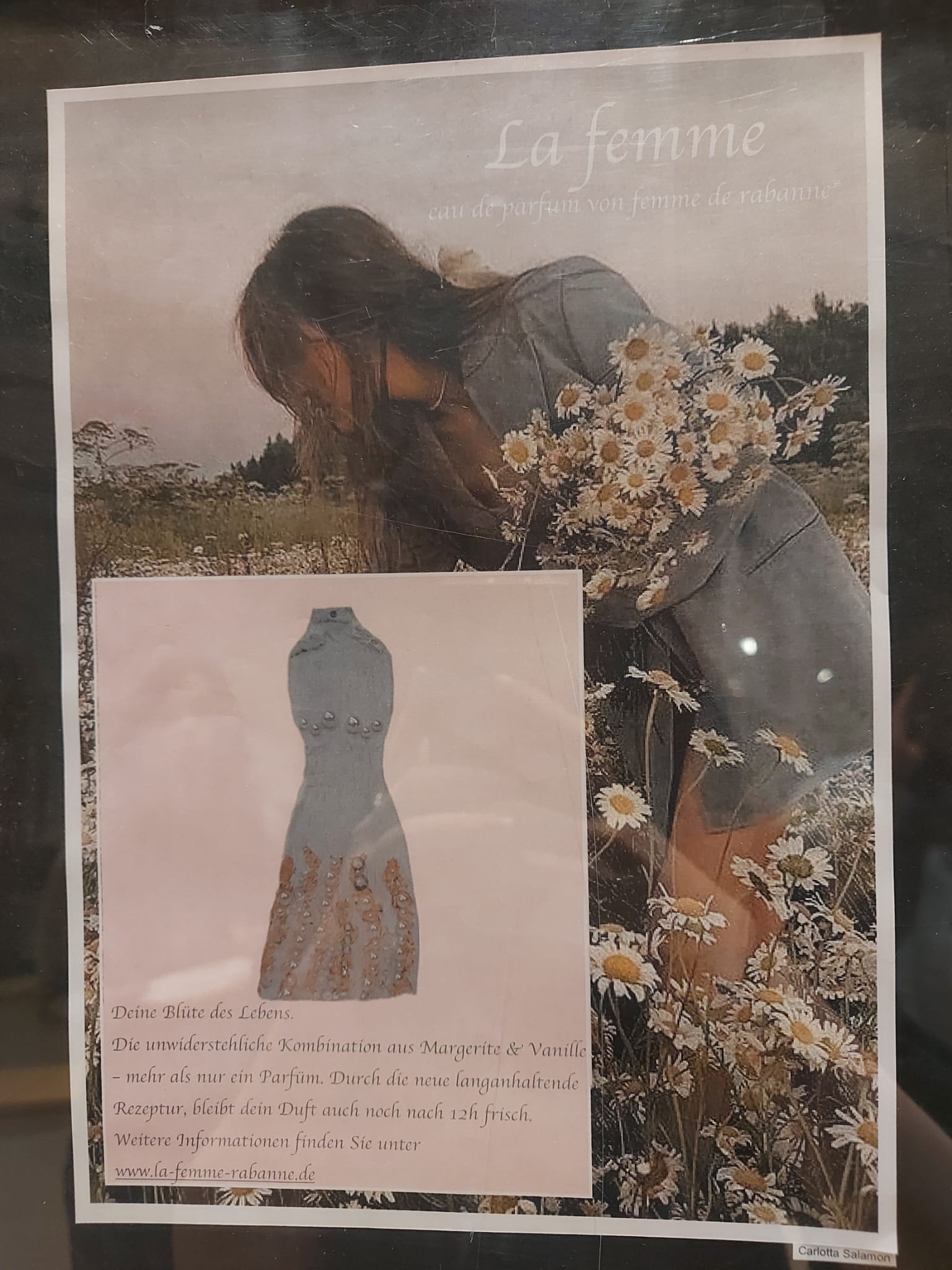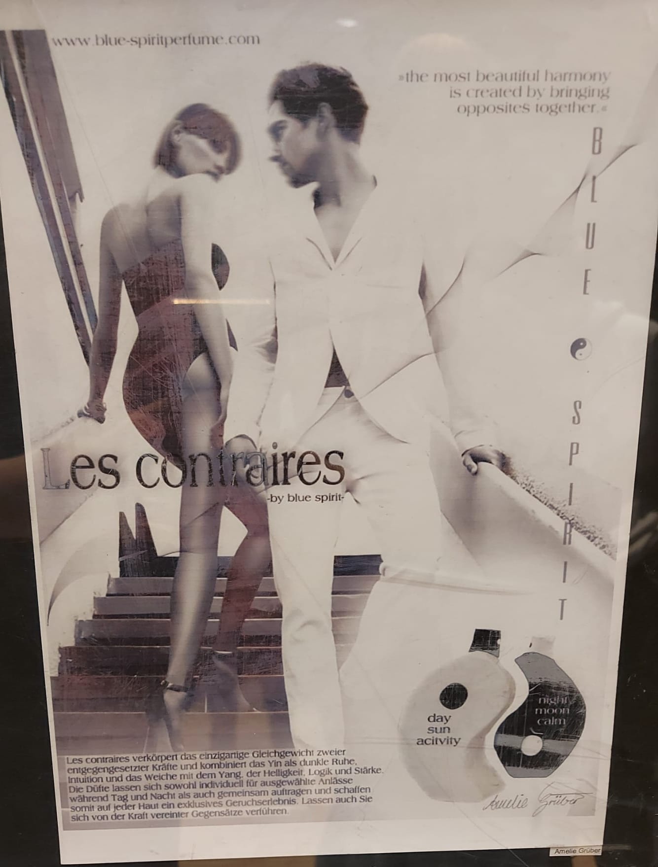 Von den Traumwelten geht es nun in die nicht weniger fiktiven Welten der Produkte und ihrer Vermarktung. Im vierten Semester war es die Aufgabe, Werbungen zu den im zweiten Semester designten Parfümflakons zu erstellen. Werbung ist wohl eher nicht das, was man landläufig unter Kunst versteht. Sie gehört zur Alltagskultur und ist heute mehr denn je ein Teil unserer Lebensrealität. Und dennoch weist die Reklame meiner Mitschüler enorme Raffinesse auf. Jedes Plakat ist eine kleine Repräsentation eines käuflichen Lebensgefühls. Die Parfüms tragen Namen wie „La femme“ oder „Les contraires“ und versprechen mal Frische und Leichtigkeit und mal Intimität und Abenteuer. Eine Mitschülerin sagte mir, dass ihnen bei der Arbeit an der Werbung „die Wichtigkeit eines gestalterischen Konzepts“ bewusst geworden sei.