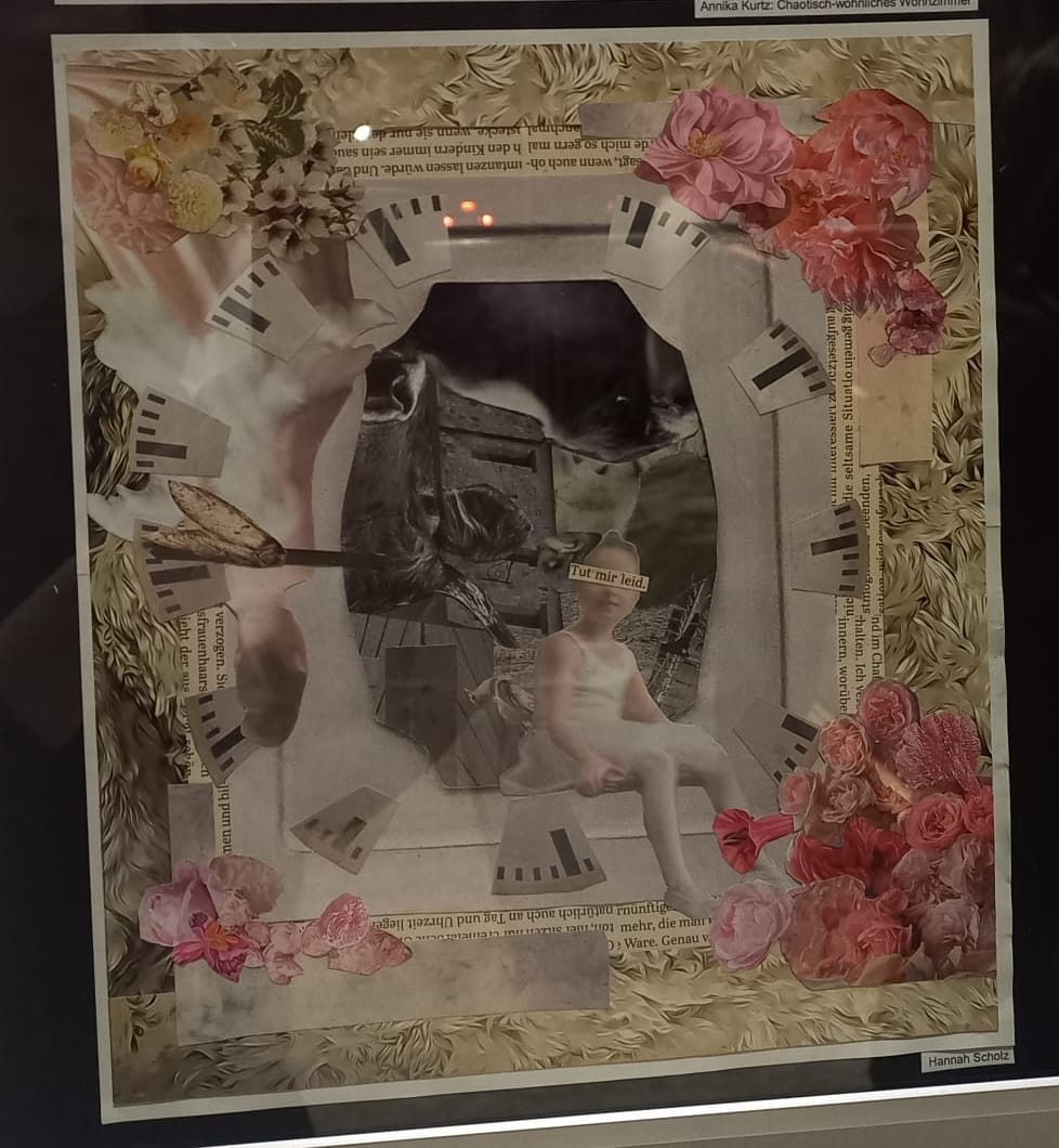 Die Collage, die neben der Fotografie im Zentrum des dritten Semesters stand, führt viele Welten in eine zusammen. Zeitungsartikel treffen mit Katalogen und Bleistiftzeichnungen aufeinander und schaffen etwas Neues. Manche Collagen sind in ihrer Bedeutung offener angelegt als andere. Allen ist das Verbinden von eigentlich Unverbindlichem gemein, Kontext stellen nur der Bildrahmen oder unscheinbare Titel wie „Ein Tag im Park“ her.